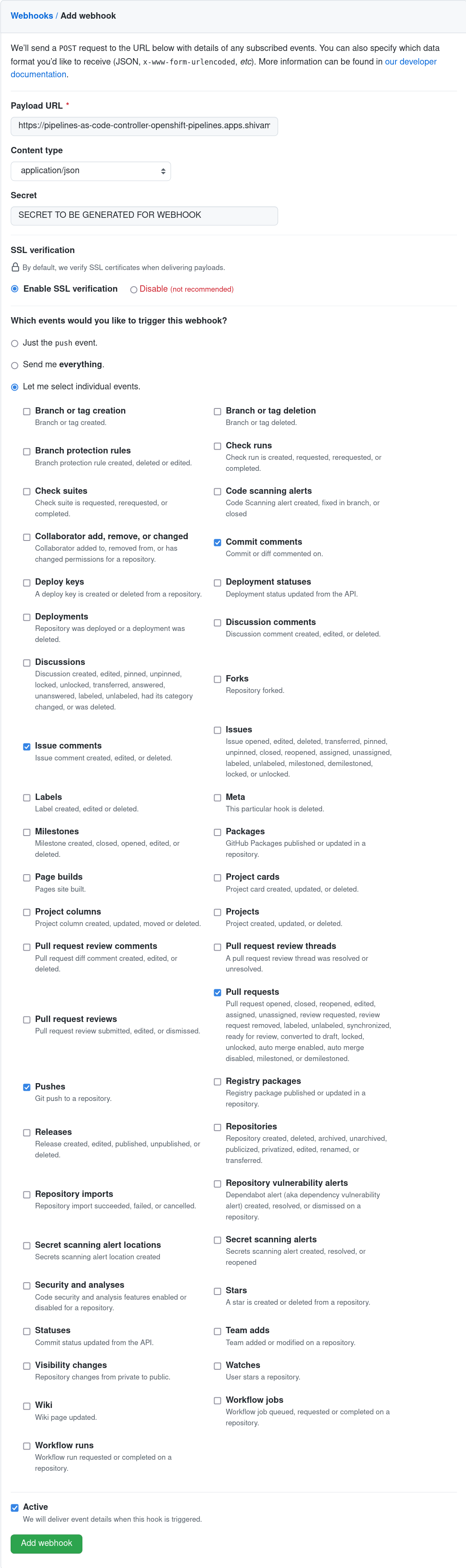 Secretwith the personal token and webhook secret in thetarget-namespace(where you are planning to run your pipeline CI):kubectl -n target-namespace create secret generic github-webhook-config \ --from-literal provider.token="TOKEN_AS_GENERATED_PREVIOUSLY" \ --from-literal webhook.secret="SECRET_AS_SET_IN_WEBHOOK_CONFIGURATION"Create the